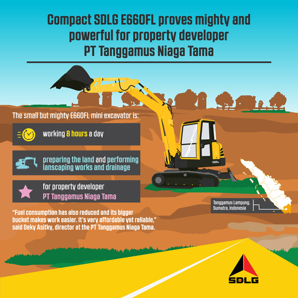 The newly launched SDLG mini excavator E660FL is proving it is small but mighty on a housing development in Indonesia. Property developer PT Tanggamus Niaga Tama is using the E660FL mini excavator to build new houses in Lampung province in Sumatra, Indonesia.