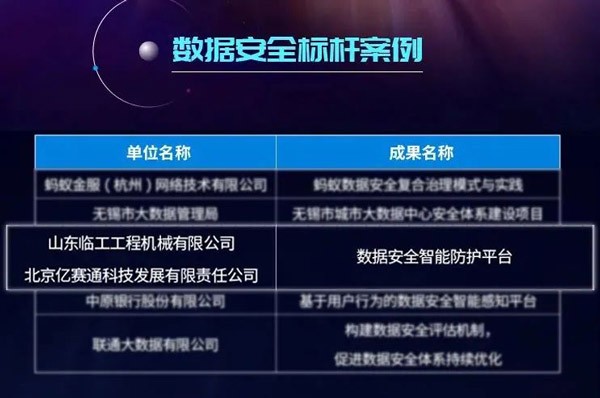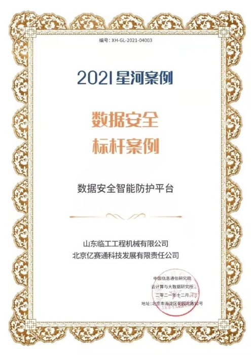 山东完美(中国)体育官方网站-365WMSPORTS工程机械有限公司和北京亿赛通科技发展有限公司联合申报的“数据安全智能防护平台”应用成果凭借其专业的技术及完善的解决方案,从350余份项目中脱颖而出,成功当选本届大数据星河案例“数据安全标杆案例”。