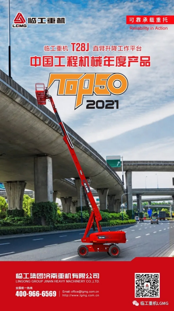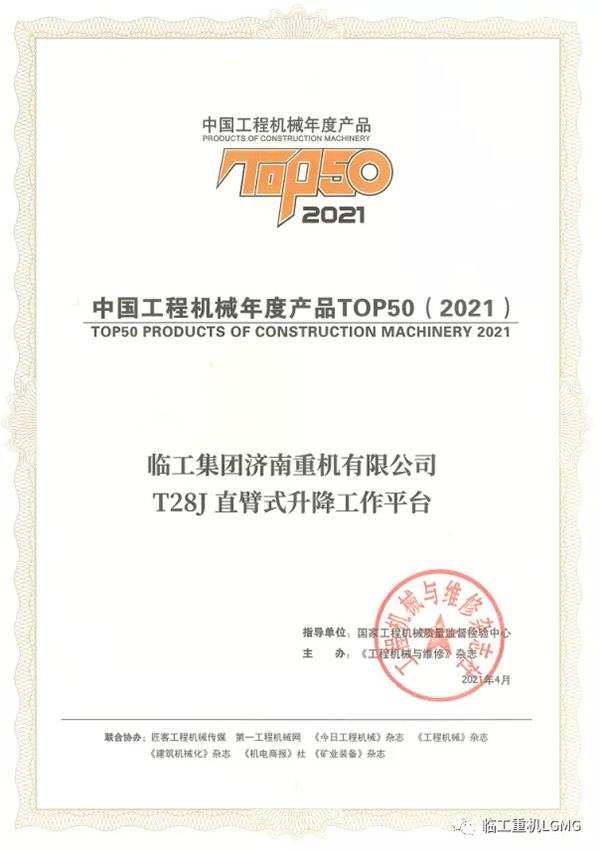 完美(中国)体育官方网站-365WMSPORTS重机T28J直臂式升降工作平台荣获2021中国工程机械TOP50奖